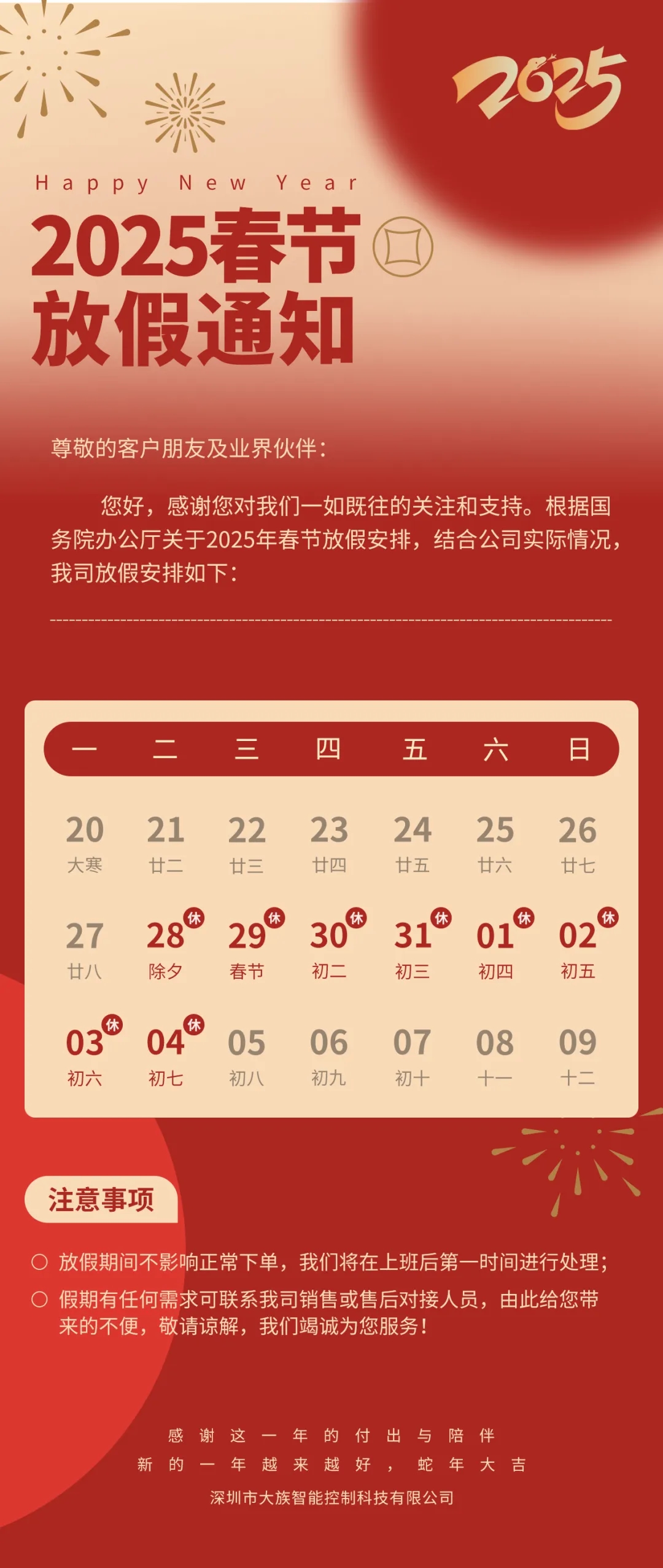靈蛇賀歲,福滿乾坤丨大族智控2025年春節(jié)放假通知