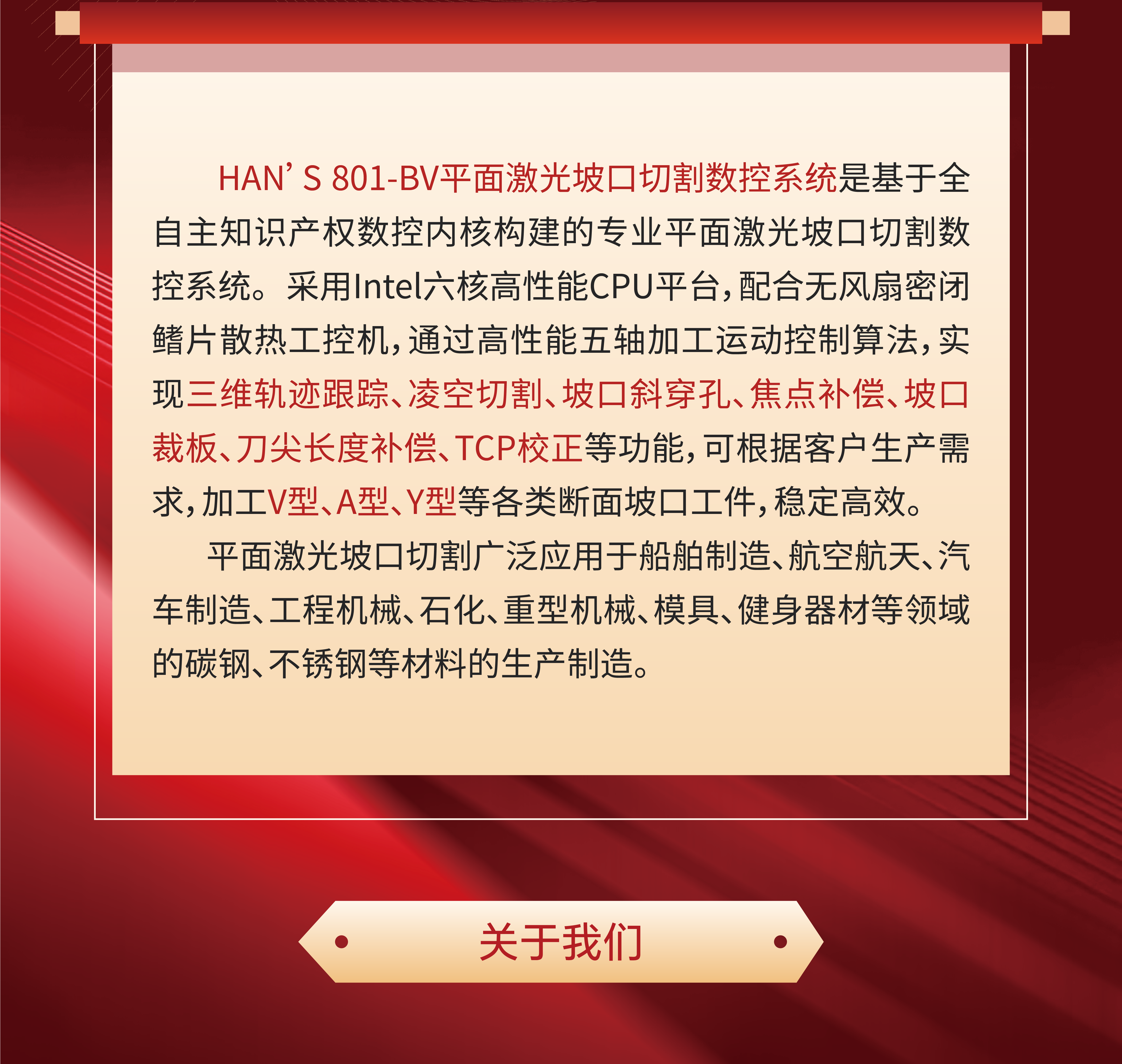 關鍵字:喜報!大族智控再獲殊榮,HAN'S 801-BV數控系統獲評2025年激光金耀獎!HAN’S 801-BV平面坡口激光切割數控系統、三維軌跡跟蹤、凌空切割、坡口斜穿孔、焦點補償、坡口裁板、刀尖長度補償、TCP校正、加工V型、A型、Y型工件、碳鋼、不銹鋼等材料生產制造