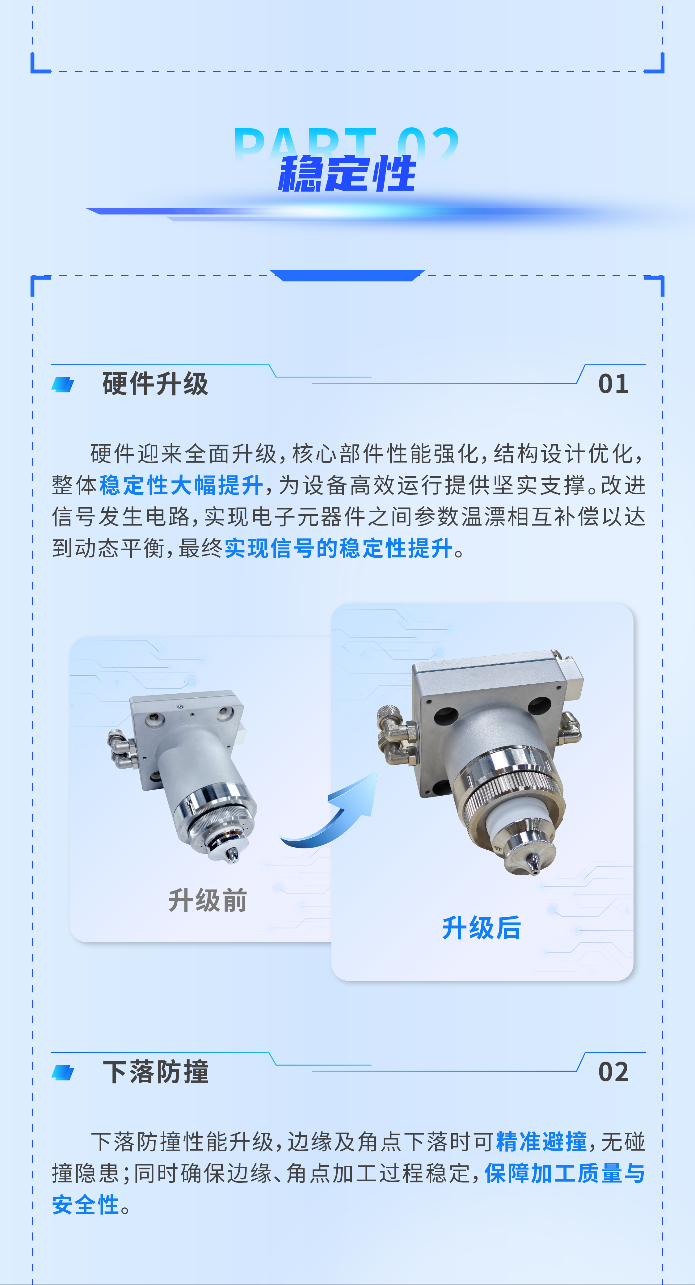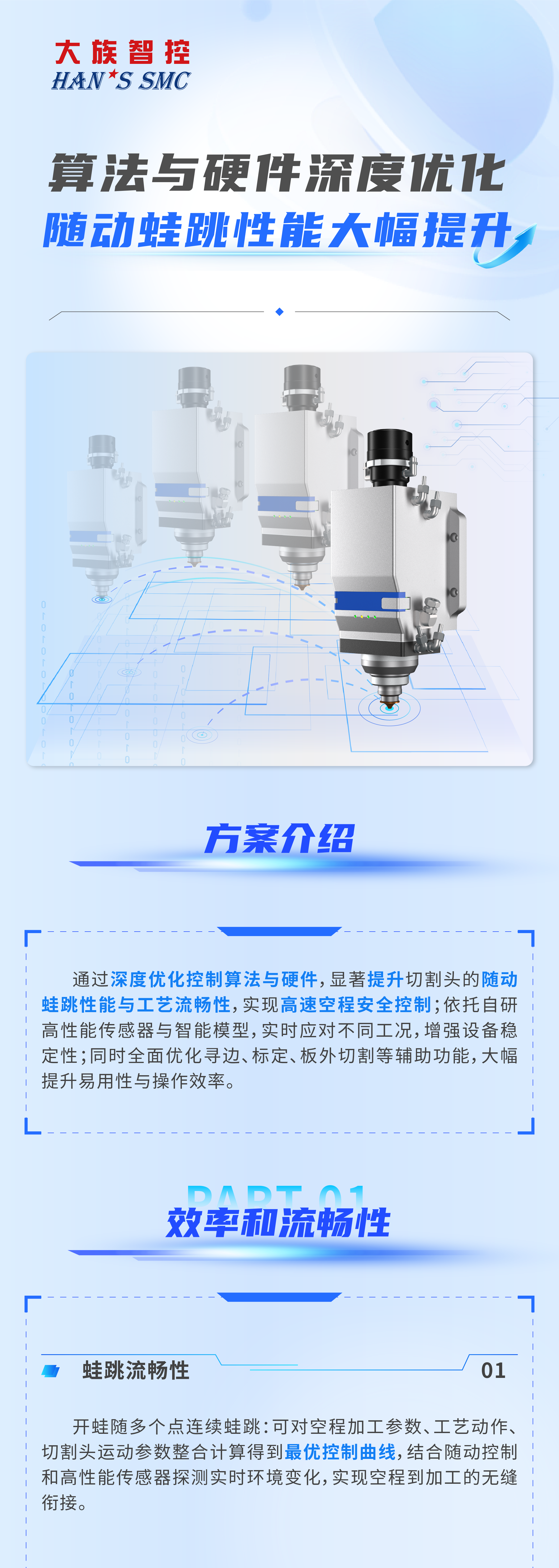 關(guān)鍵詞:大族智控、算法與硬件深度優(yōu)化、隨動(dòng)蛙跳性能大幅提升、蛙跳、無(wú)感穿孔、隨動(dòng)速度、硬件升級(jí)、下落防撞、長(zhǎng)時(shí)間加工可靠性、尋邊、板外切割、高速標(biāo)定