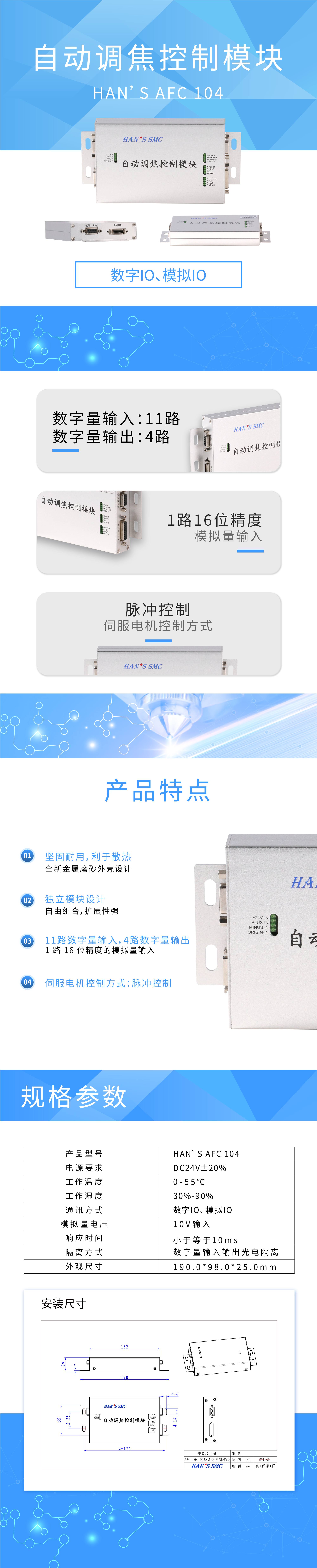 HAN'S AFC 104模塊是本公司針對工業自動化控制推出的新一代產品,僅需幾路數字量和1路模擬量,就可實現對1臺伺服電機的控制,方便總線系統對非總線激光切割頭的調焦控制。